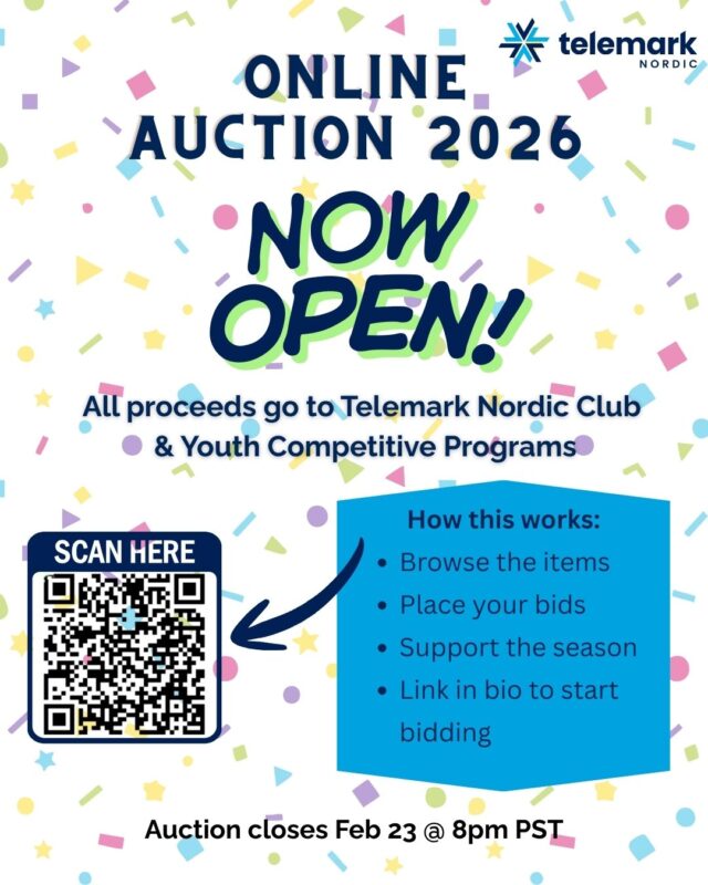 Check out Telemark’s on-line auction fundraiser. Click on the Auction Link here or scan the QR code below or in the poster to bid on a variety of great items, from skis and gear to art, concert tickets, coffee beans, jewelry, puzzles and more! All proceeds support the Telemark Nordic Club & Telemark Youth Competitive Programs .
